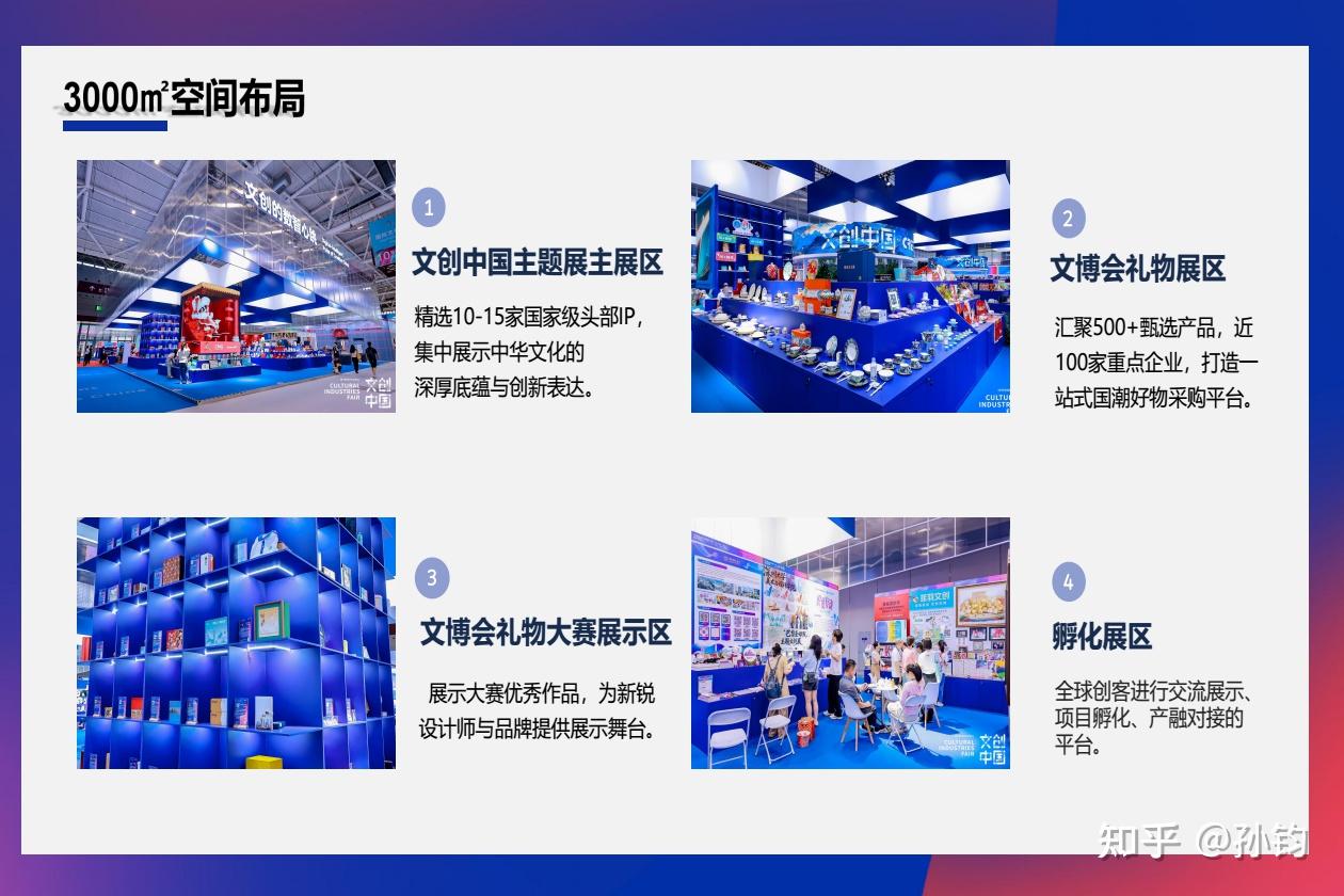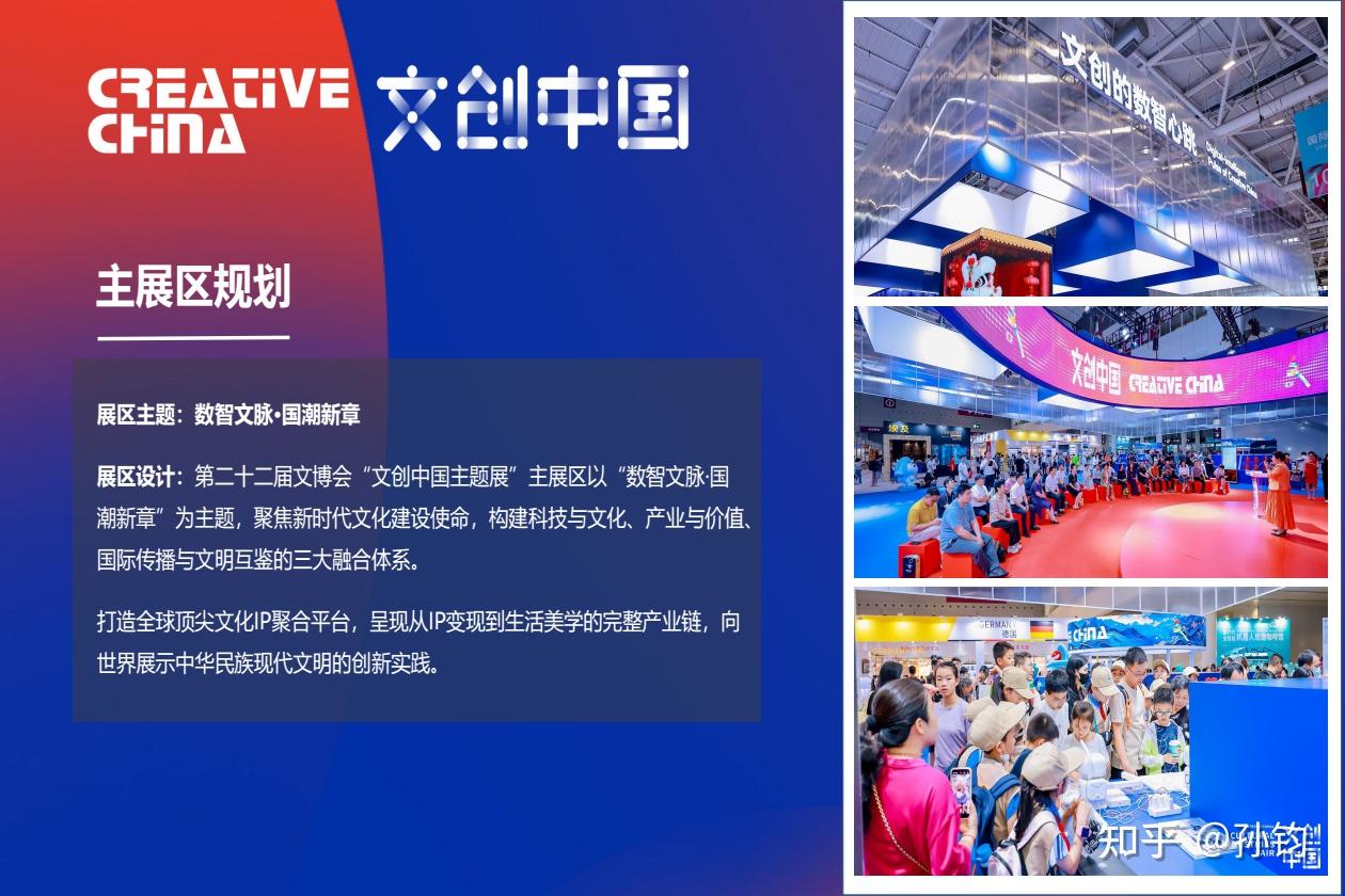 集中展示体现中华优秀传统文化创造性转化和创新性发展的国礼工美重器、网红博物馆文创、全国文创企业最新文化产品等各类精品文创消费产品,设“文创中国”“文博会礼物”“大赛展示”及“孵化展区”四大板块,打造全球顶级文化IP聚合平台,全面呈现中国文创深厚底蕴、高端品质和高质量发展水平。