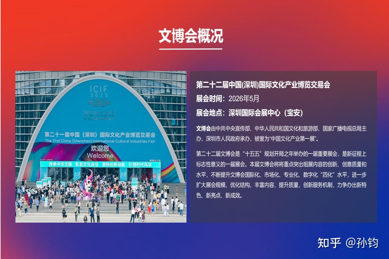 文博会由中共中央宣传部、中华人民共和国文化和旅游部、国家广播电视总局主办,深圳市人民政府承办,被誉为“中国文化产业第一展”。