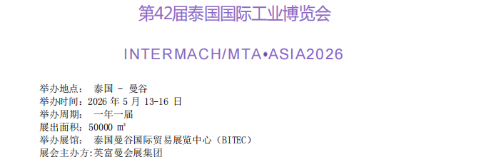 第42届泰国国际工业博览会 时间:2026 年 5 月 13-16 日 地点: 泰国 - 曼谷 周期: 一年一届 展出面积:50000 ㎡ 金属加工机床,钣金设备,3D 打印系统和复合材料,各类量刃具,各类检测设备及系统,模具及模具制造,各类电焊设备与材料, 涂装及表面处理,电气系统、控制系统、 自动化系统、机械人、电机及传动设备,各类液压件、气动件,手动工具、电动工具、紧固件、轴承、泵阀、工业配件、弹簧及五金件,材料处理设备和存储系统、物流与运输设备,塑料橡胶加工机械、包装机械。